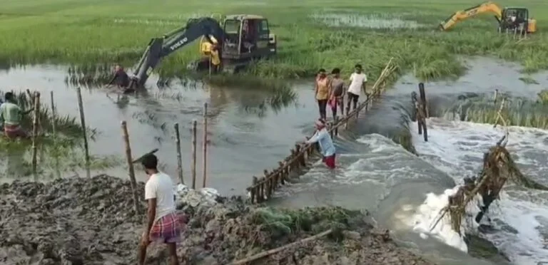 পিঙ্কি পালঃ দক্ষিণ চব্বিশ পরগণাঃ গতকাল দক্ষিণ চব্বিশ পরগণার গোসাবায় পূর্ণিমার কোটালের জেরে রায়মঙ্গল নদীর প্রায় দু’শো ফুট মাটির নদী বাঁধ ভেঙে গেছে। এতে গোসাবা ব্লকের অন্তর্গত আমতলী গ্রাম পঞ্চায়েতের পুঁইজালি গ্রামে বন্যার জল ঢুকে গিয়েছে। আর নদীর নোনা জল সরাসরি চাষের জমিতে ঢুকে পড়ে। এমনকি যে যে পুকুরে মাছ চাষ করা হয় সেই সব পুকুরেও নদীর জল ঢুকে পড়ে। আবার রাতেরবেলা জোয়ারের সময় নদীর জল ঢুকে পড়েছে।