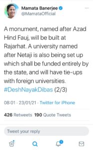 এর পাশাপাশি ট্যুইটের মাধ্যমে মুখ্যমন্ত্রী জা্নিয়েছেন, “এবার ২৬ শে জানুয়ারী কুচকাওয়াজেও নেতাজিকে স্মরণ করা হবে। এদিনের ট্যুইটে ফের কেন্দ্রের কাছে নেতাজির জন্মজয়ন্তীকে জাতীয় ছুটির দিবস ঘোষণা করার দাবী জানান মমতা বন্দ্যোপাধ্যায়”।